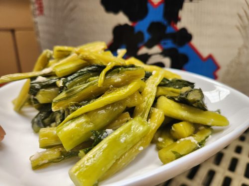 自社農園の野沢菜を丁寧に付け込み、酒の肴に美味しく漬かりました。